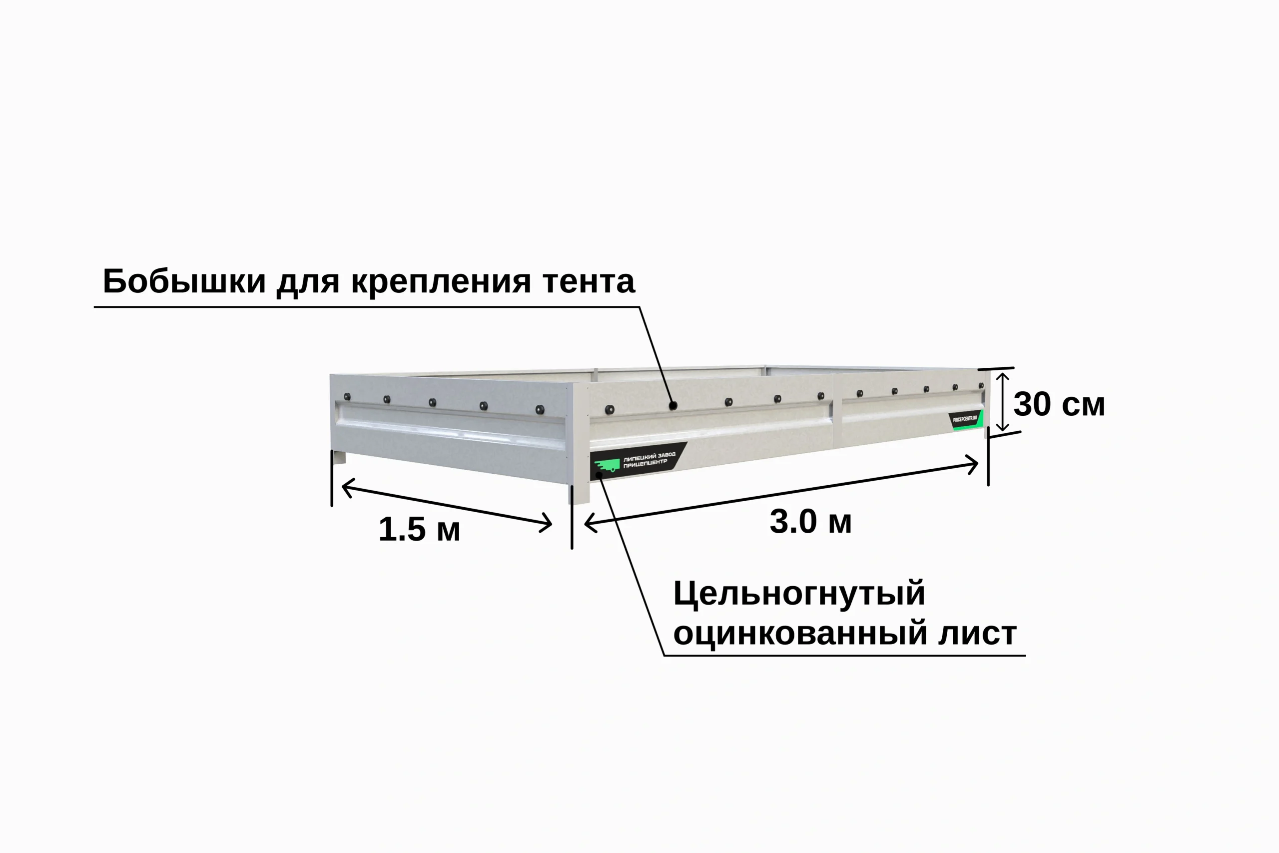 Борта изготовлены из оцинкованной стали толщиной 0,8 мм. Оснащены отверстиями для монтажа дуг тента и бобышками для натяжения тросов. Полностью готовы к установке на прицеп.