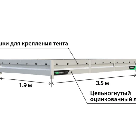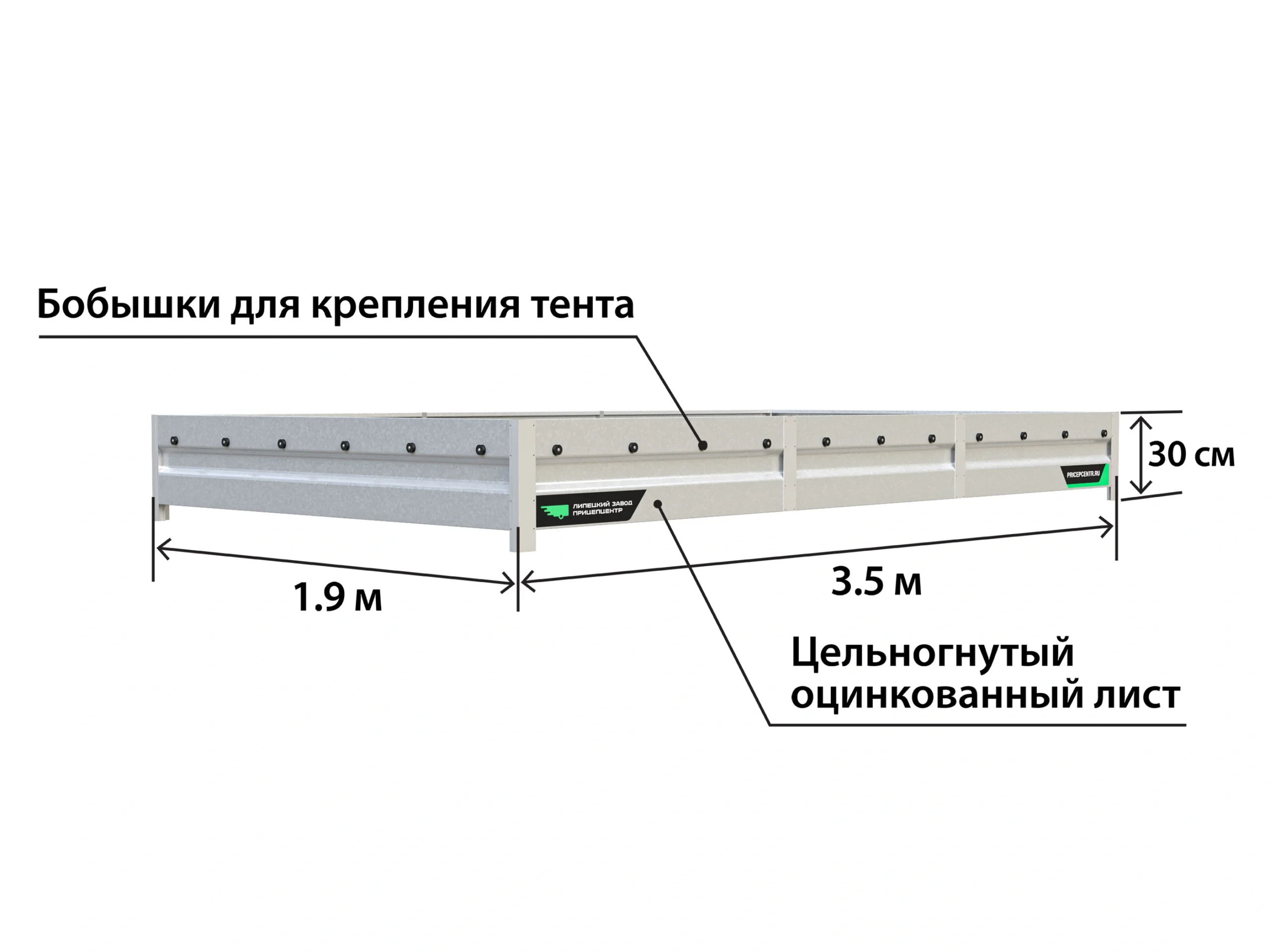 Борта изготовлены из оцинкованной стали толщиной 0,8 мм. Оснащены отверстиями для монтажа дуг тента и бобышками для натяжения тросов. Полностью готовы к установке на прицеп.