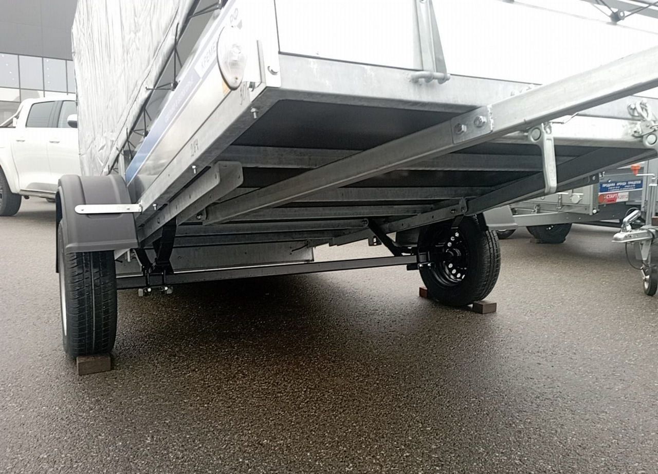 Основа прицепа — рама из профиля 60×40 мм с горячим цинкованием и усиленным подрамником. Ходовая часть включает ось 50×50 мм (4 мм), ступицу ВАЗ-2108, амортизаторы ВАЗ-2101 и рессоры Alko (4 листа, до 950 кг). Конструкция рассчитана на стабильную работу под нагрузкой без деформации и подходит как для стройки, так и для универсального использования.