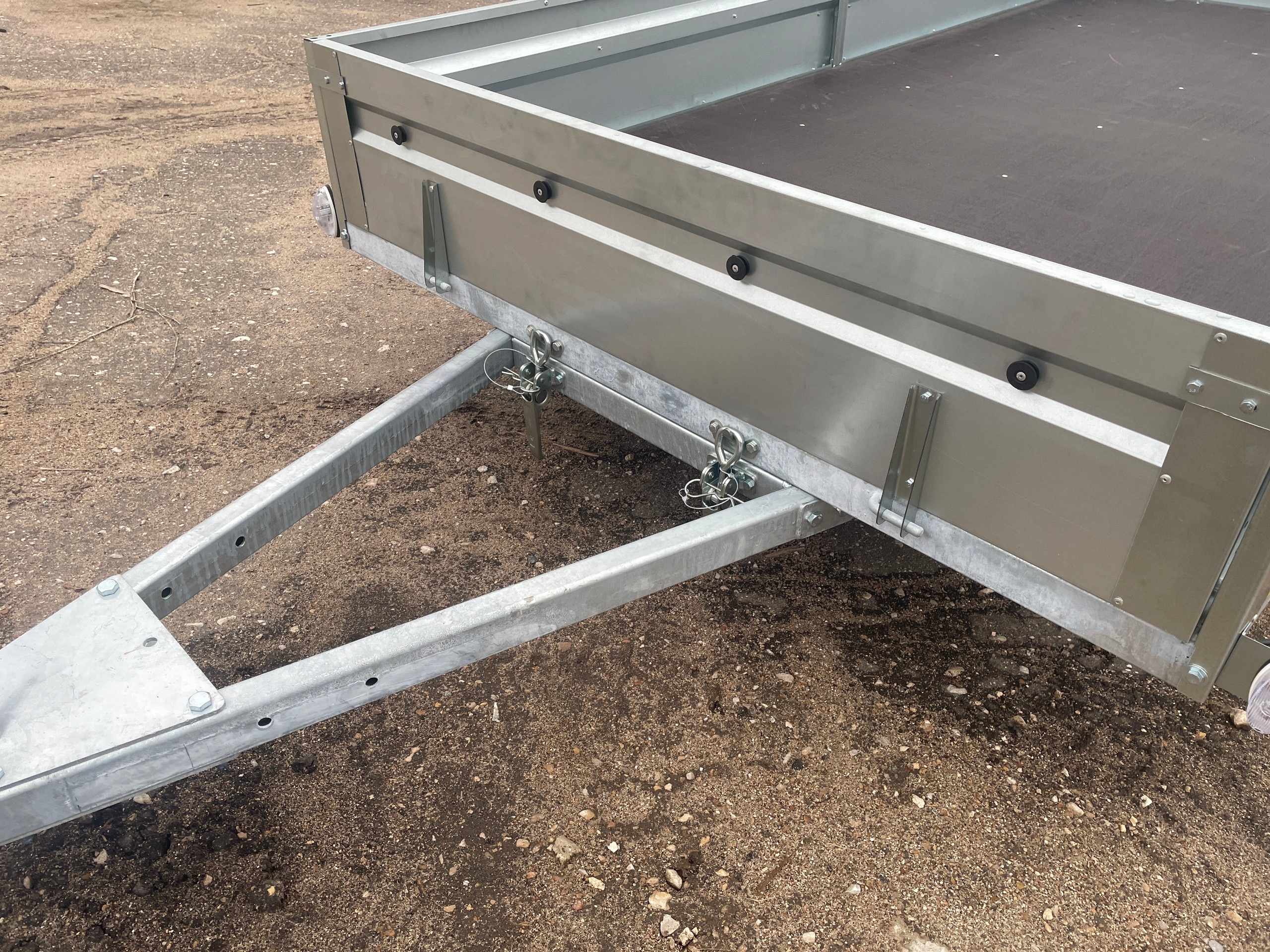 Борта выполнены из оцинкованного металла толщиной 0,7 мм и имеют высоту 310 мм. Конструкция включает усиленные стойки, съёмные передний и задний борта, а также задний борт с замковым механизмом. Оцинковка обеспечивает защиту от коррозии и увеличивает срок службы прицепа при эксплуатации в условиях влаги и реагентов.